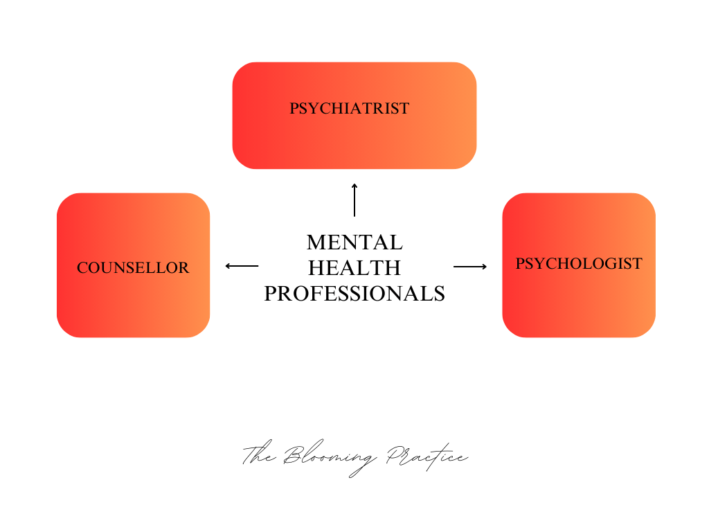 There are various terms used to describe mental health professionals with each of them helping clients in their own unique way. There are many different mental health professionals who support and assist with a wide range of mental health concerns. The main types of mental health professionals are psychiatrists, psychologists, and counsellors.